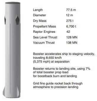 推进器将包含42个猛禽引擎,长77.5米,宽12米,它是至今为止历史上最强大的火箭,所以之前马斯克将其命名为Big Fucking Rocket。